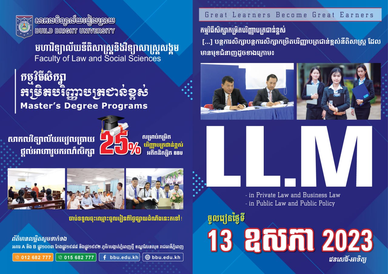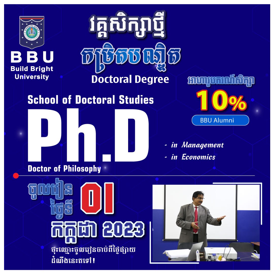វគ្គសិក្សាថ្មី កម្រិតបណ្ឌិត សូមជូនដំណឹងនិស្សិតដែលបានប្រឡង ជាប់ជាស្ថាពរលើថ្នាក់បរិញ្ញាបត្រជាន់ខ្ពស់ នៅសាកលវិទ្យាល័យបៀលប្រាយ នឹងទទួលបានអាហារូបករណ៍សិក្សា 10% ⇨សិក្សាជាមួយសាស្រ្តាចារ្យបណ្ឌិតជាតិ និងអន្តរជាតិល្បីៗ ដែលមានបទពិសោធន៍ និងចំណេះដឹងខ្ពស់ ដែលមានជំនាញដូចខាងក្រោម៖