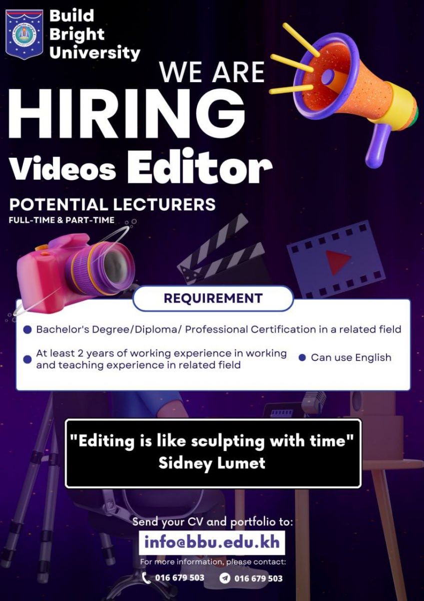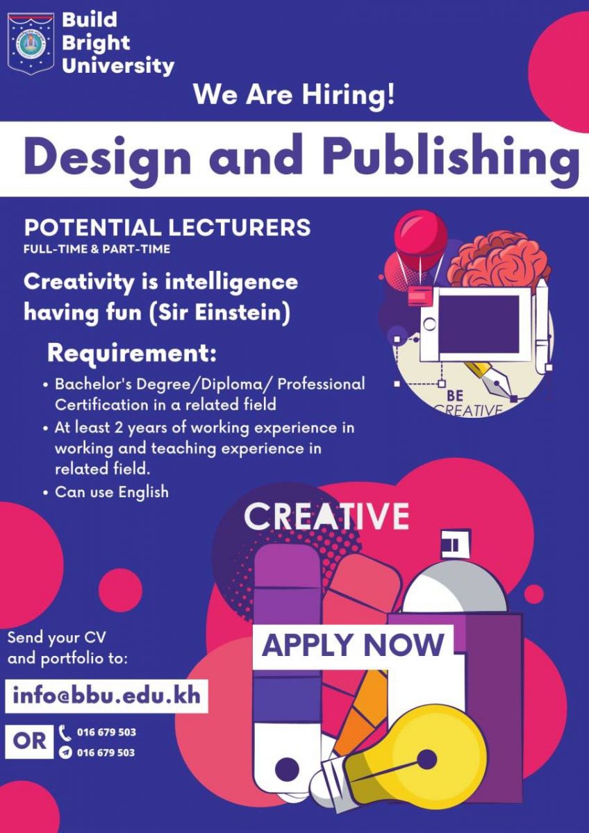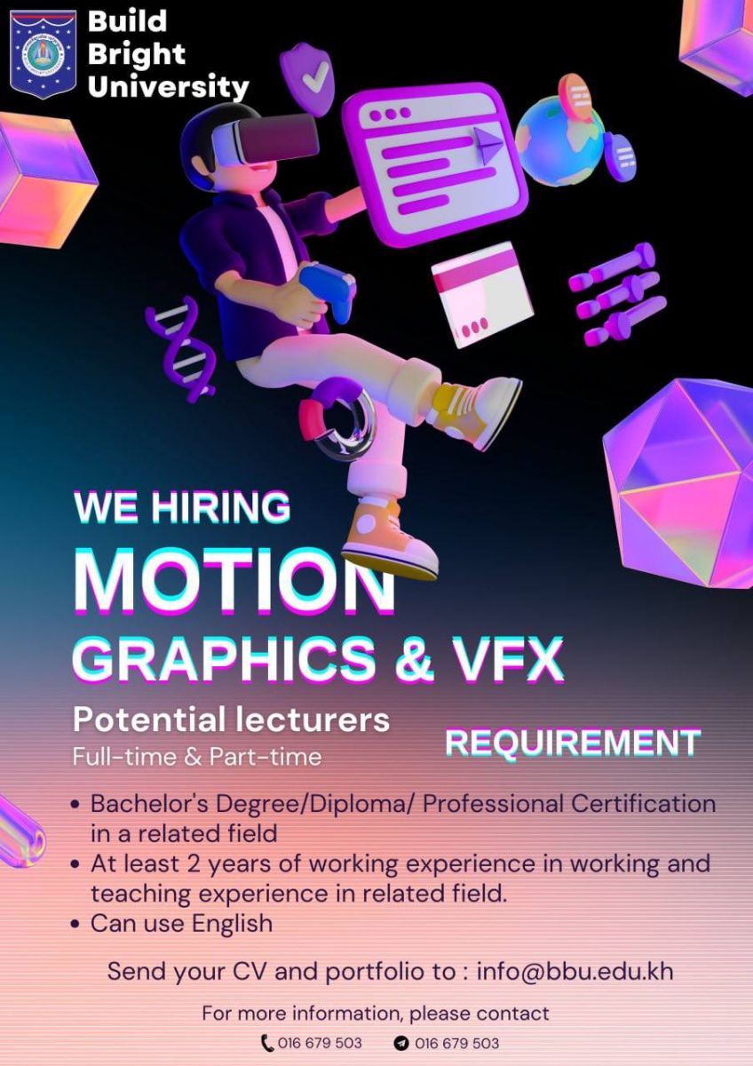 សាកលវិទ្យាល័យបៀលប្រាយ (BBU) ត្រូវការជ្រើសរើសសាស្រ្តាចារ្យទៅលើមុខជំនាញ Digital Media Design ជំនាញ Photographer or Photos/Videographer, Media for Drawing (Sketch & Storyboard), Design and Publishing ( PS, AI & InDesign), Motion Graphics (After Effects & VFX) Video Editor (Adobe Premiere & Davinci Resovle), Media Production, Social Media Communication, UX/UI Designer, Cinema 4D, Digital Marketing, Content Writer ជាច្រើនរូប។