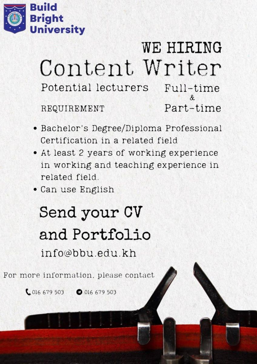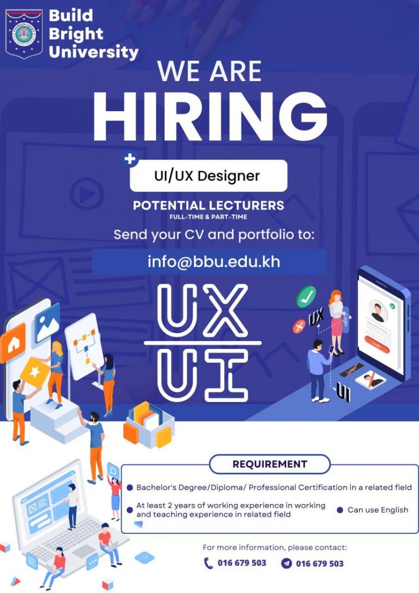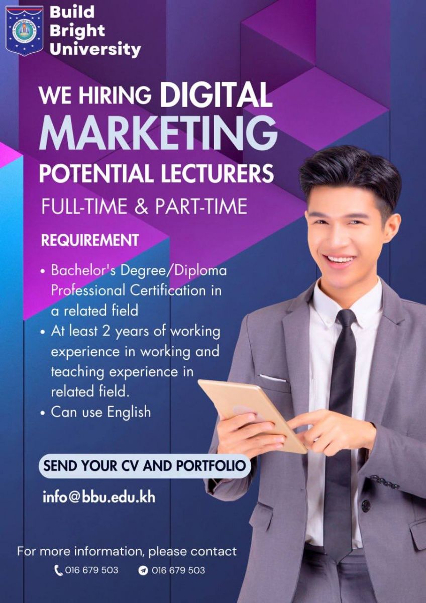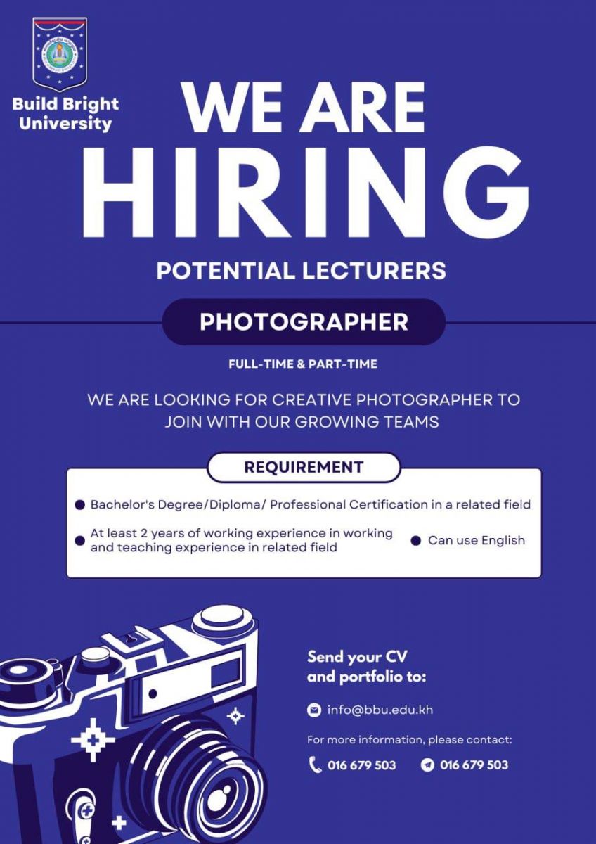 សាកលវិទ្យាល័យបៀលប្រាយ (BBU) ត្រូវការជ្រើសរើសសាស្រ្តាចារ្យទៅលើមុខជំនាញ Digital Media Design ជំនាញ Photographer or Photos/Videographer, Media for Drawing (Sketch & Storyboard), Design and Publishing ( PS, AI & InDesign), Motion Graphics (After Effects & VFX) Video Editor (Adobe Premiere & Davinci Resovle), Media Production, Social Media Communication, UX/UI Designer, Cinema 4D, Digital Marketing, Content Writer ជាច្រើនរូប។