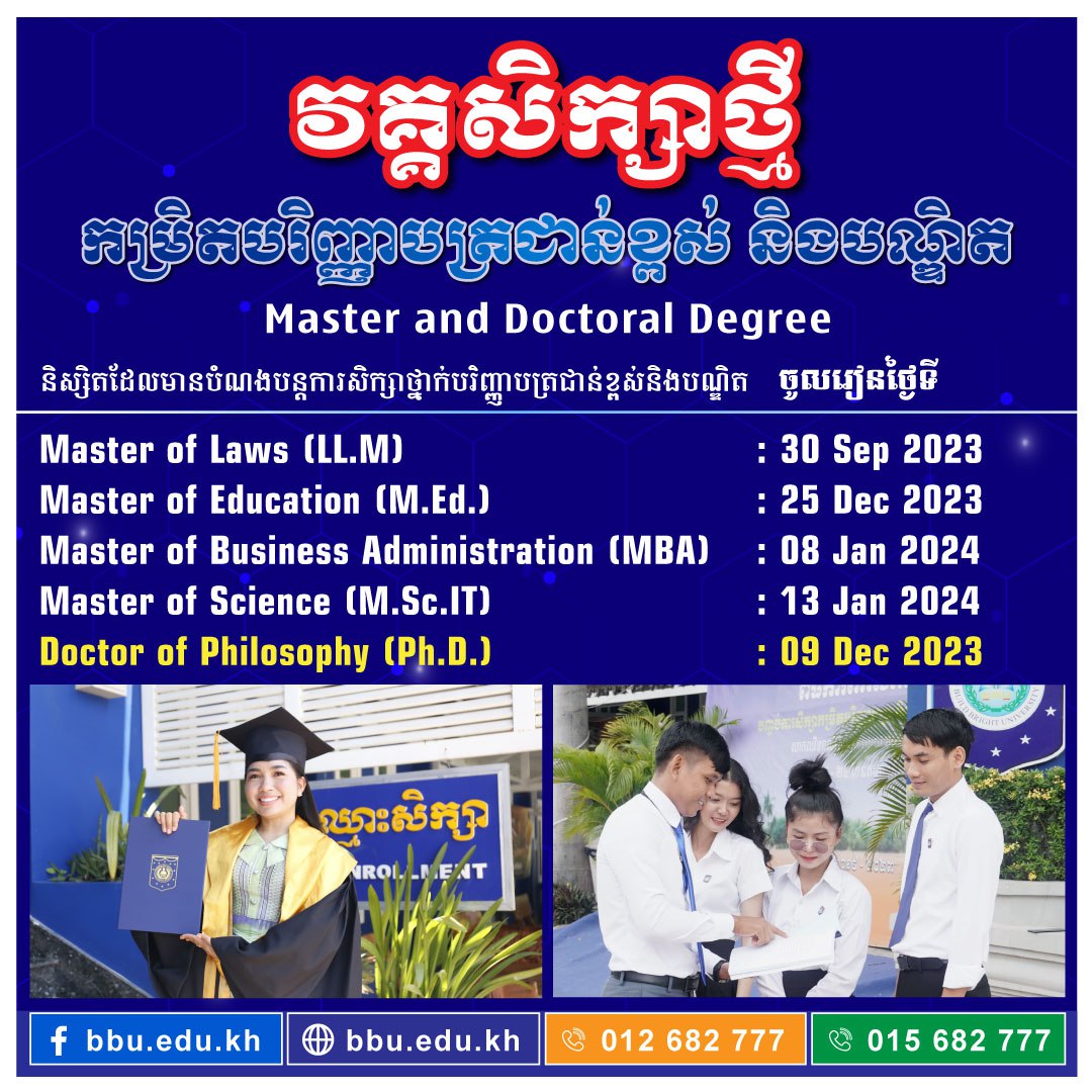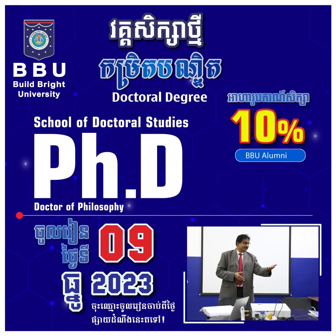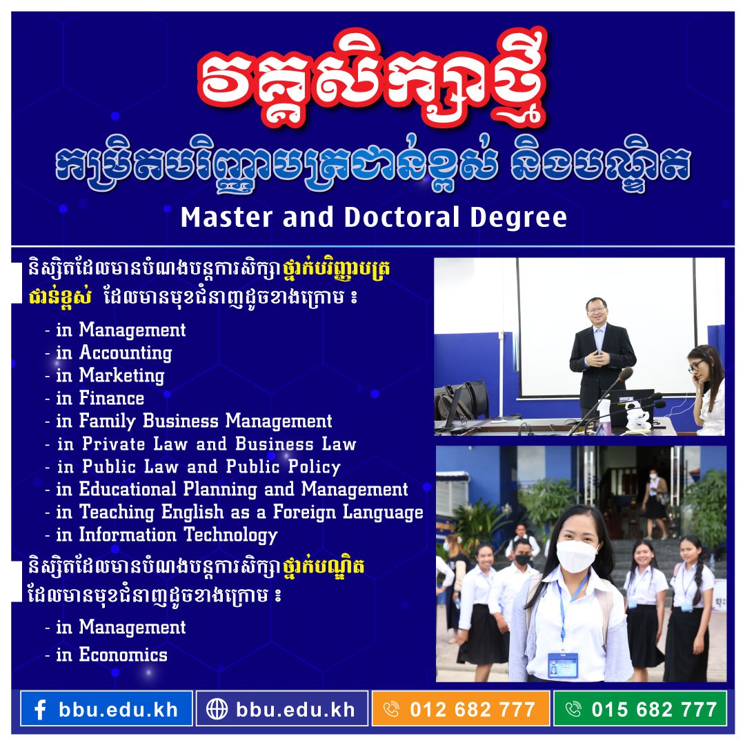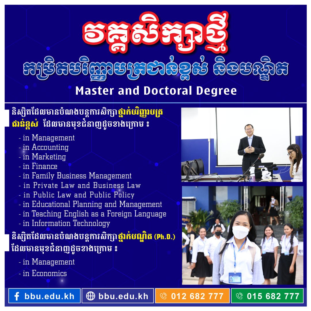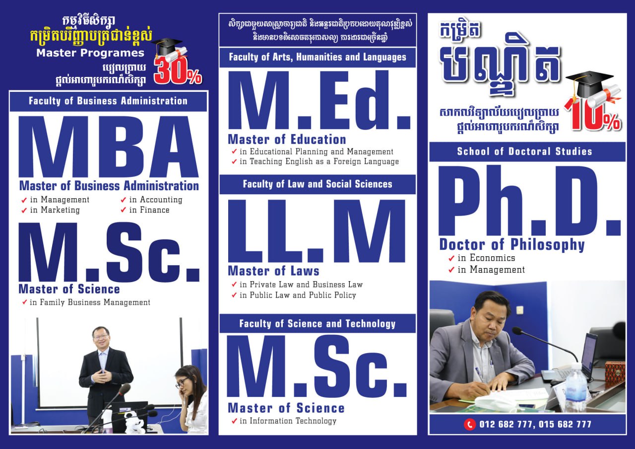 វគ្គសិក្សាថ្មី កម្រិតបណ្ឌិត សូមជូនដំណឹងនិស្សិតដែលបានប្រឡង ជាប់ជាស្ថាពរលើថ្នាក់បរិញ្ញាបត្រជាន់ខ្ពស់ នៅសាកលវិទ្យាល័យបៀលប្រាយ នឹងទទួលបានអាហារូបករណ៍សិក្សា 10% ►សិក្សាជាមួយសាស្រ្តាចារ្យបណ្ឌិតជាតិ និងអន្តរជាតិល្បីៗ ដែលមានបទពិសោធន៍ និងចំណេះដឹងខ្ពស់ ដែលមានជំនាញដូចខាងក្រោម៖