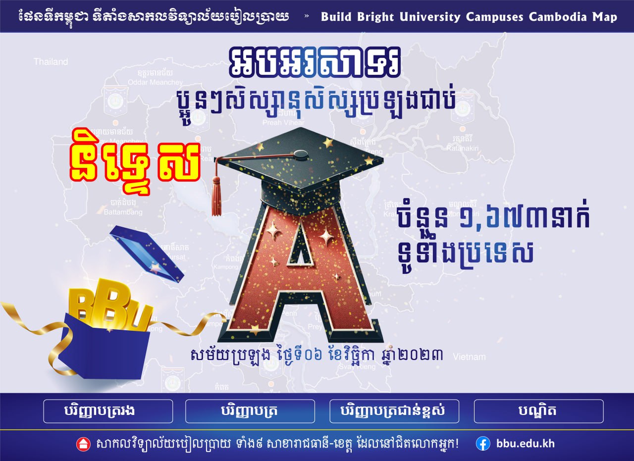 សូមអបអរសាទរ ប្អូនៗសិស្សសានុសិស្សប្រឡងជាប់ និទ្ទេស A ចំនួន ១,៦៧៣នាក់ សម័យប្រឡង ថ្ងៃទី០៦ ខែវិច្ឆិកា ឆ្នាំ២០២៣ ក្នុងឱកាសនេះ សាកលវិទ្យាល័យបៀលប្រាយ (BBU) ក៏មានផ្តល់អាហារូបករណ៍តាមនិទ្ទេសដោយស្វ័យប្រវត្តិ ពីនិទ្ទេស A ដល់ និទ្ទេស F សិស្សប្រឡងជាប់បាក់ឌុបឆ្នាំណាក៏ដោយ ក៏អាចទទួលបានអាហារូបករណ៍បានដែរ ។