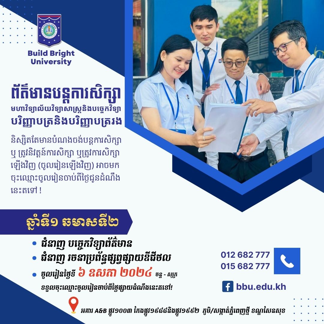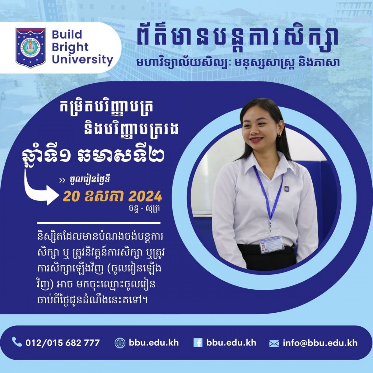 ព័ត៌មានបន្តការសិក្សា វគ្គសិក្សាថ្មី ថ្នាក់បន្តឆមាសថ្មី សាកលវិទ្យាល័យបៀលប្រាយ រាជធានីភ្នំពេញ