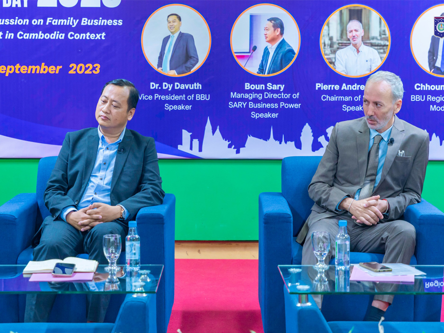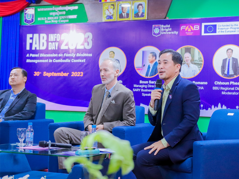 On Saturday, 30 September 2023, Build Bright University, Siem Reap Campus, organized the "FAB Info Day" for the Master of Science in Family Business Management. "In the Hall of Building E of Build Bright University, Siem Reap, with 3 honorary speakers: 1. Dr. Dy Davuth, Senior Vice President of Build Bright University 2. Mr. Buon Sary, CEO of SARY Busiess Power; and 3. Mr. Pierre Andre Romano, Chairman of SATCHA, held a panel discussion on the challenges and sustainability of family businesses management and to promote the Master of Science program in Family Business Management with 102 participants, including business owners such as AutoLubes Siem Reap, Kubuta Svay Thom Siem Reap, Standa Electric, Business Association Women, Business Association BNI, Manulife Insurance, Angkor Destination, Pov Panha Investment Co., Ltd, Survival Swimming Club, ABA Bank, Vattanac Asia Bank, Canadia Bank Plc., ACLEDA Bank Plc., LOLC Microfinance Institution and Alumni of Build Bright University, Siem Reap Campus.