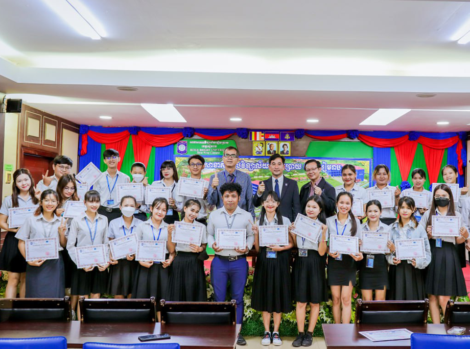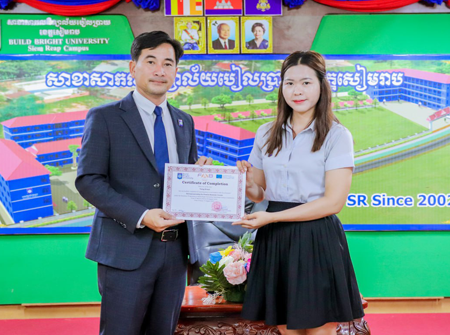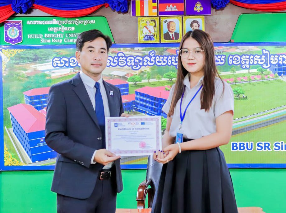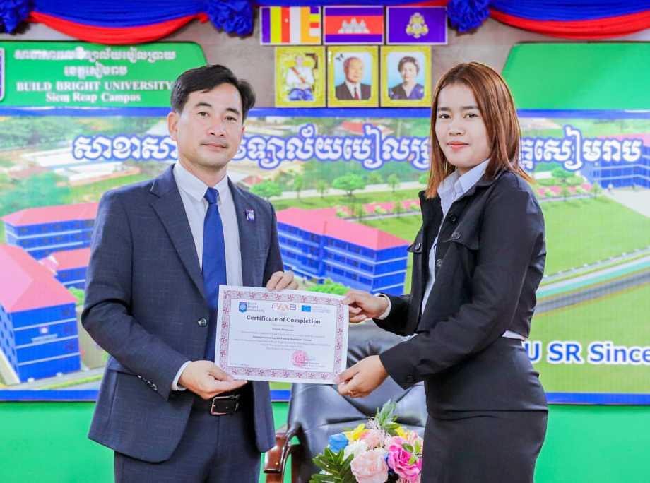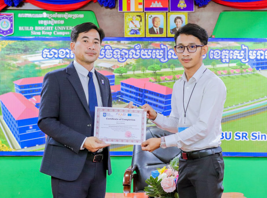 On 26 October 2023, Build Bright University, Siem Reap Campus, organized a Graduation Ceremony for the students who attended the 45-hour short course on "Entrepreneurship for Family Business" which is supported by the Erasmus+ Program. Significantly, the graduation ceremony was under the chairmanship of Mr. Chhoun Phearun, Campus Director of Build Bright University, Siem Reap Campus.