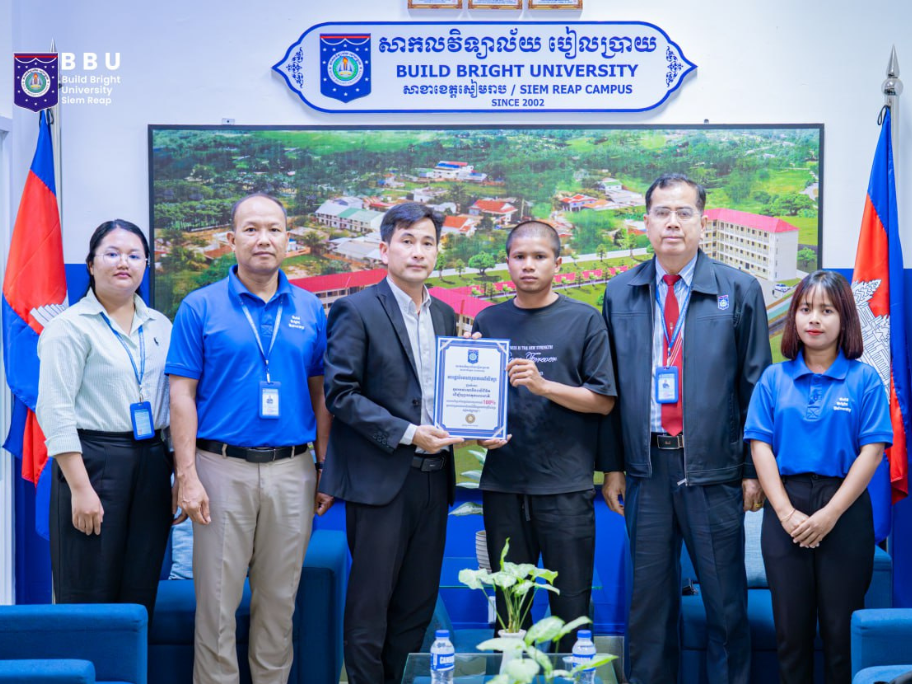 Build Bright University has granted a full (100%) scholarship for the entire duration of the study program to Mr. Yeung Mai Rak, a first-year, second-semester student at the Faculty of Law and Social Sciences, Build Bright University, Siem Reap Campus.